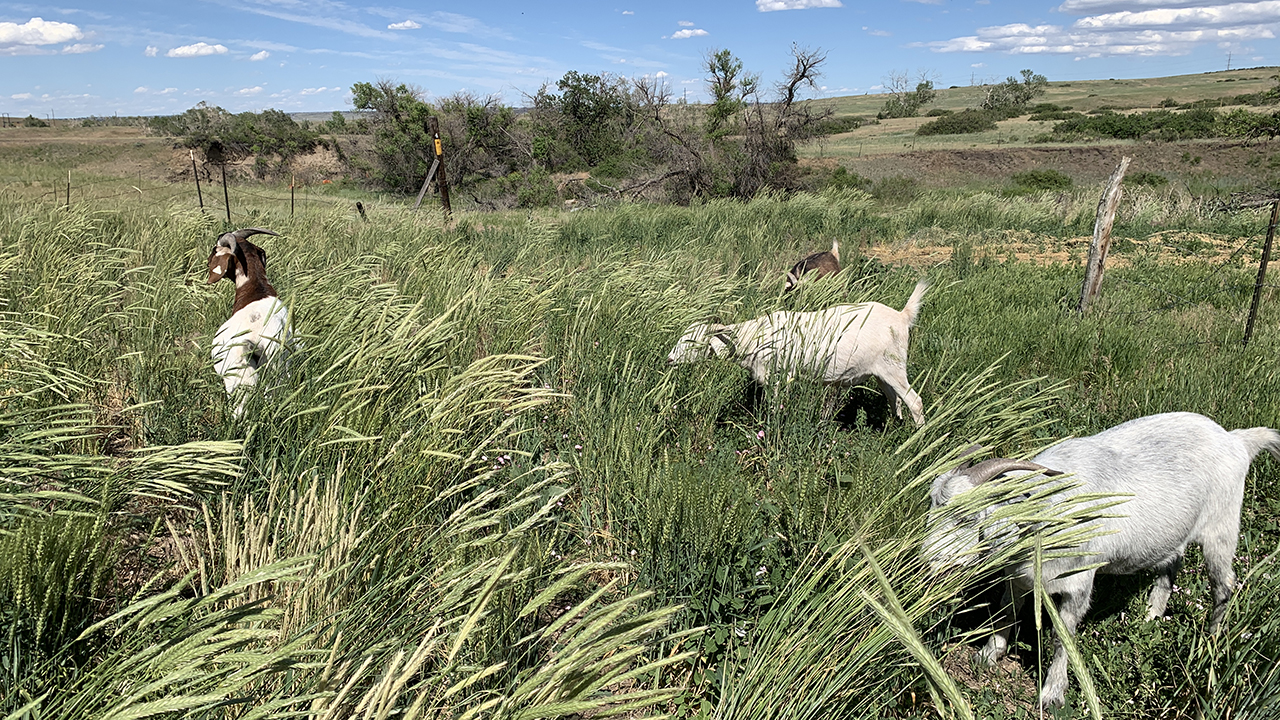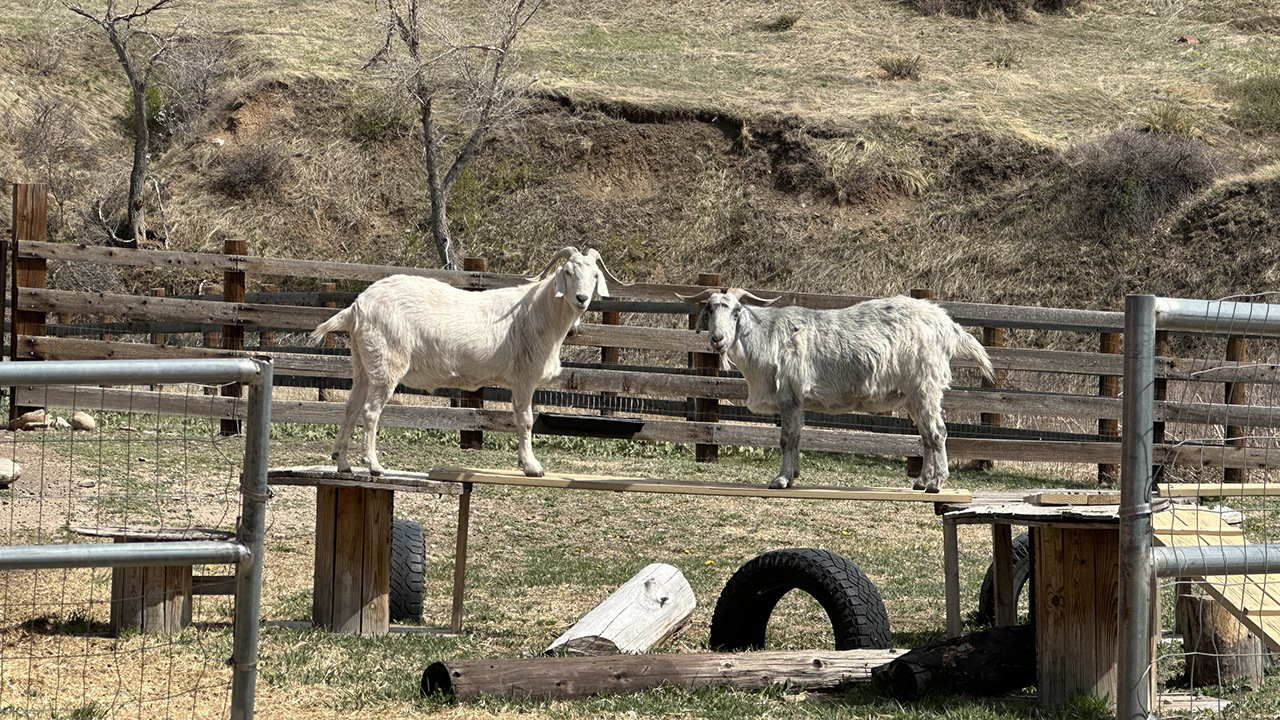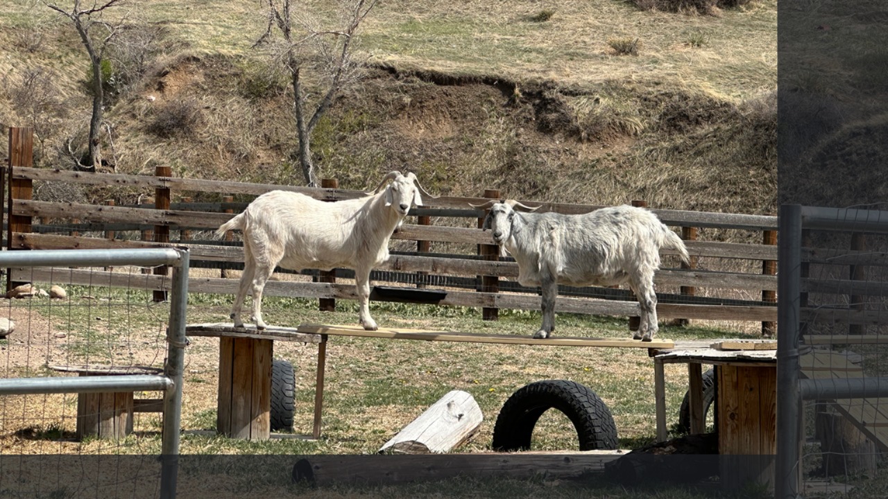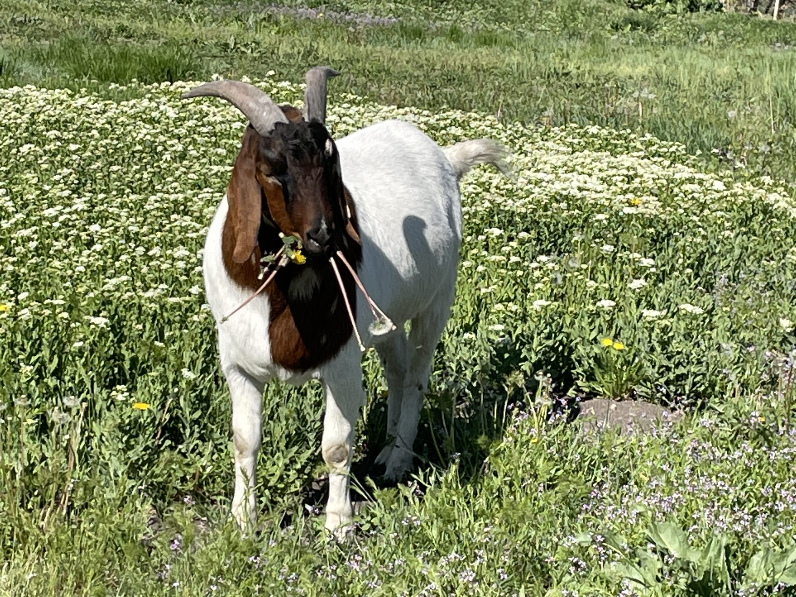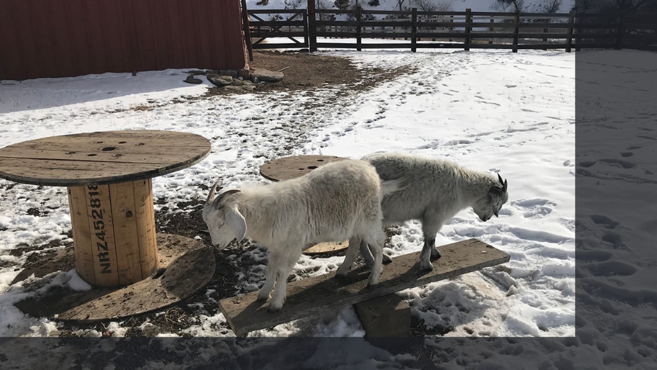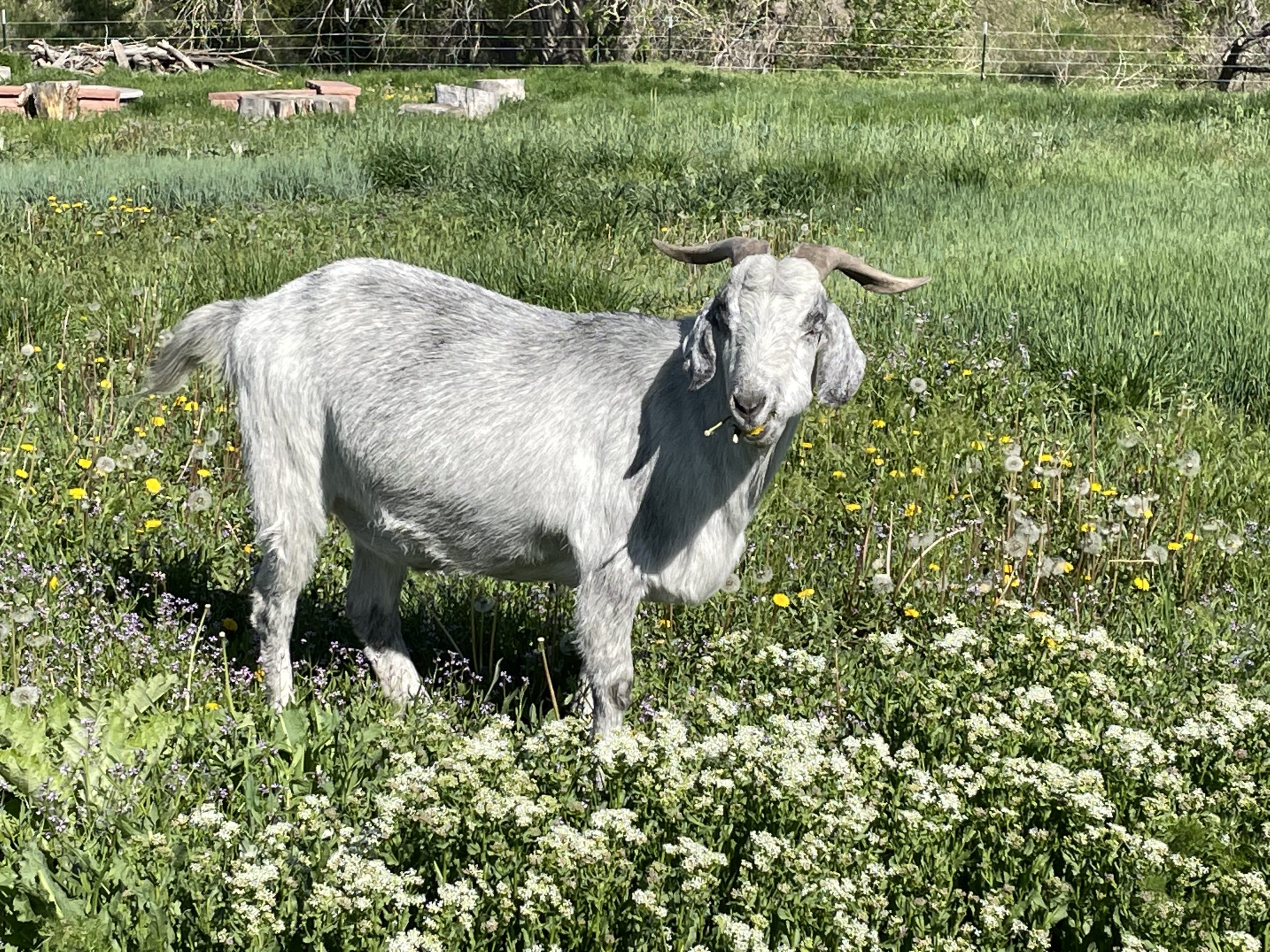 The goats were purchased in 2018 from a 4H family in northern Colorado. At the time of purchase the goats were four months old and small enough to fit all together inside a large dog crate for transportation. Now they have grown to 200+ pounds, and each eat roughly 3 pounds of grass per day, along with natural grazing.