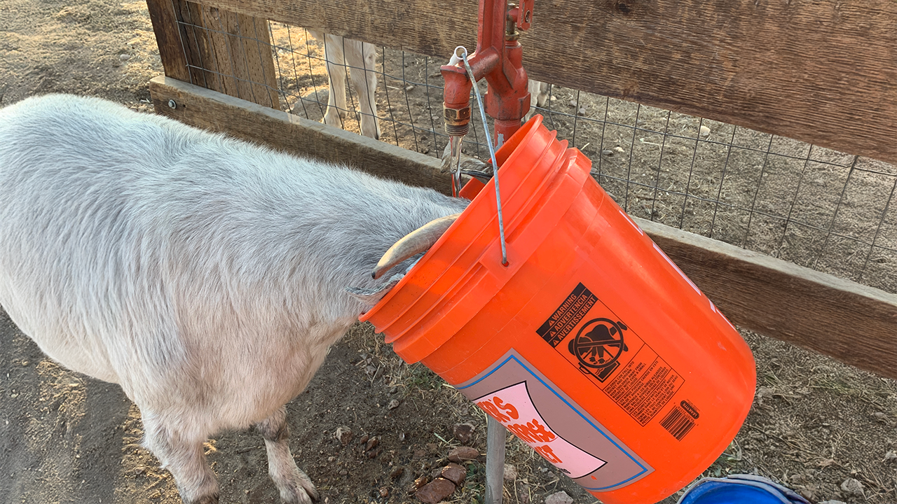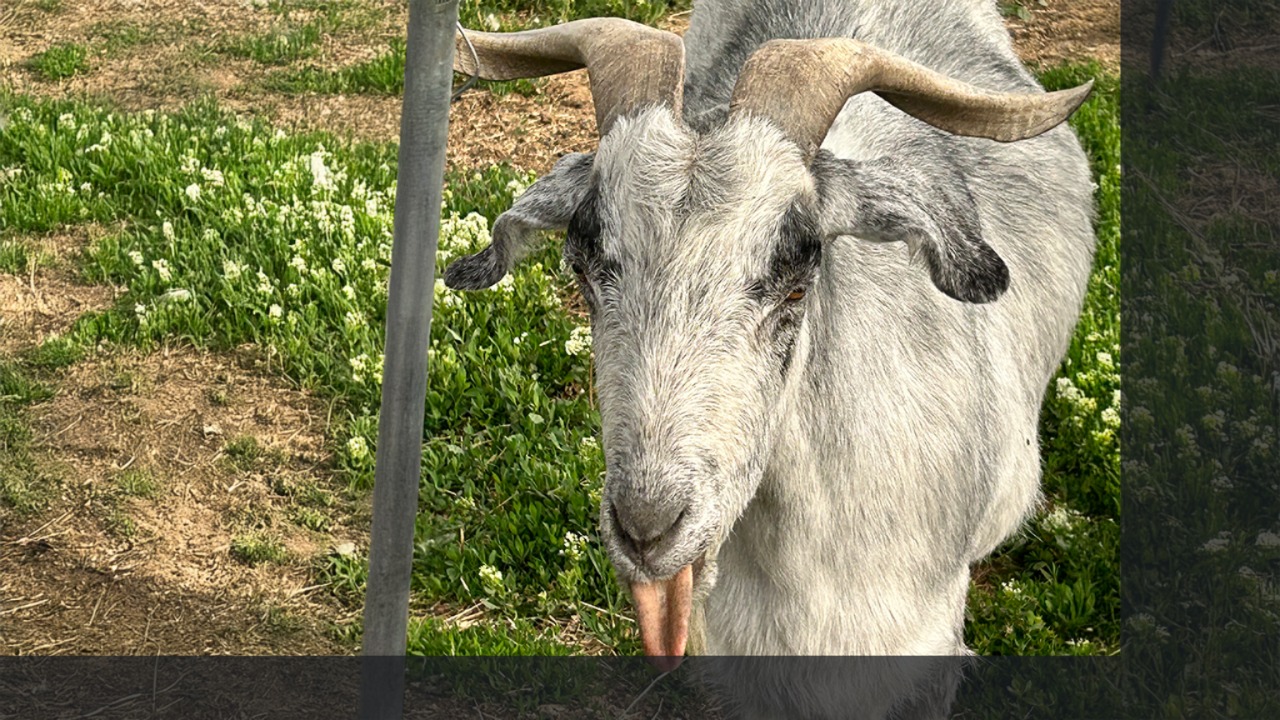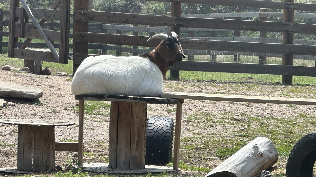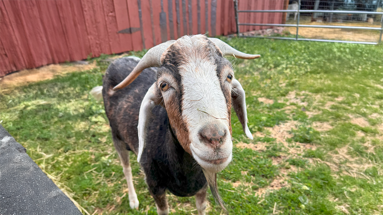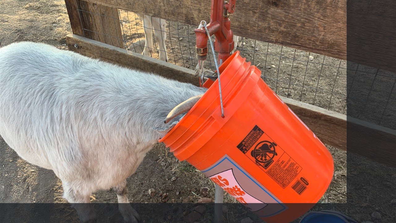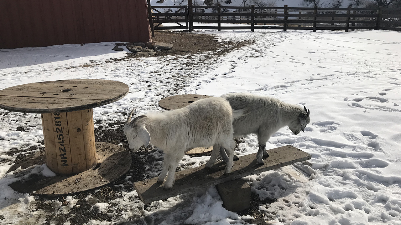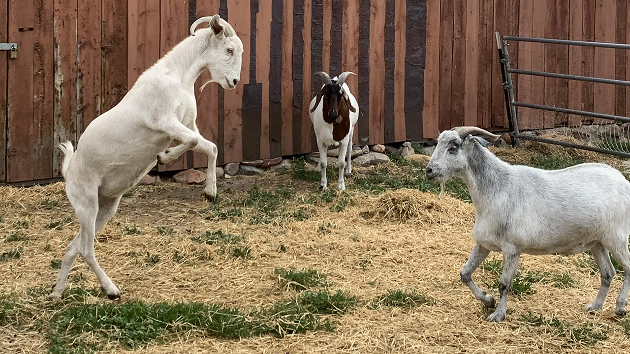 Interesting goat facts: An average life span of a goat is 7-14 years; although we hope our ornery boys will be around for a long time! A common myth is that goats can eat anything. While some goats are bred for landscape mitigation, the Schweiger goats are very picky about what they eat and have sensitive stomachs, limiting their feed options to Timothy grass and natural grasses found on the Ranch when grazing. Similar to cows, goats have a four-chambered stomach to help them digest tough roughage. Our goats do not like to get wet. During storms and cold weather, you can find them sheltering under the historic loafing shed or in an enclosed room attached to the barn to stay dry and warm. They also are very particular about the temperature of their water and won’t drink water that is too cold. During the winter months, their water is slightly heated to keep it at a comfortable temperature and avoid freezing.