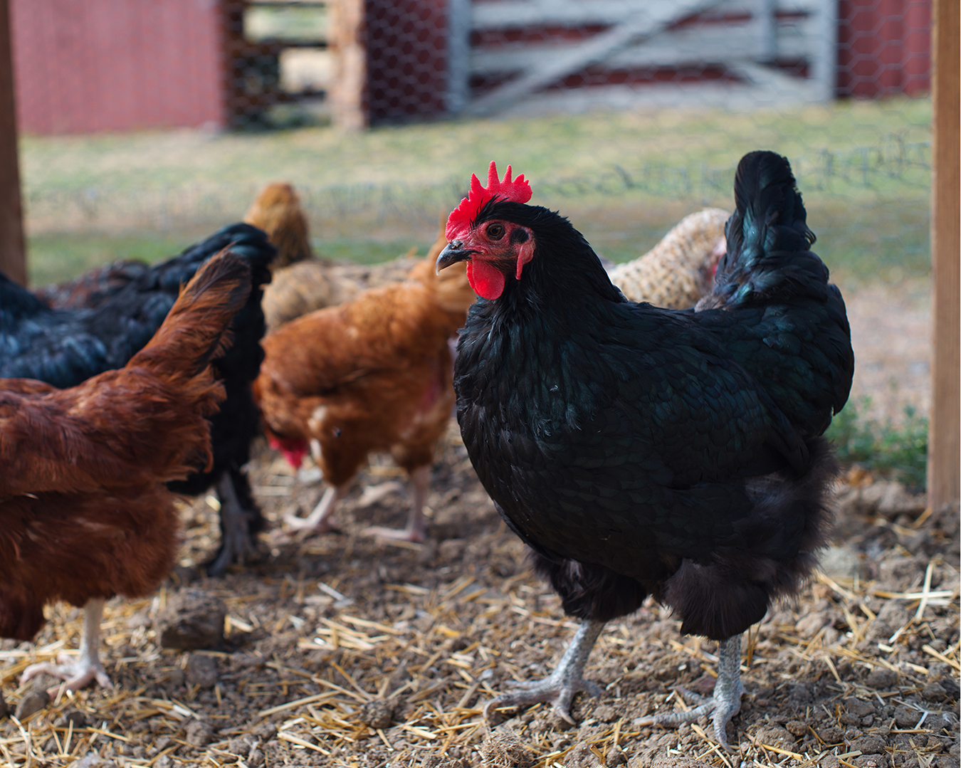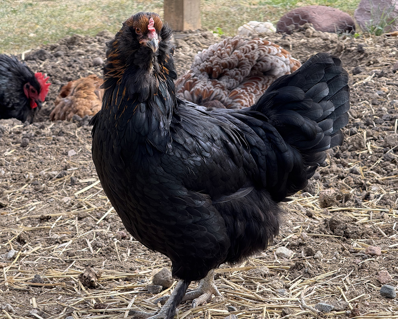 The Black Australorp was developed in Australia in the early 1900s by crossing Black Orpingtons with other breeds, with the goal of creating a hardy, climate-tolerant chicken that excelled in egg production. Their sleek black plumage shimmers with a green sheen in sunlight, making them quite striking in the yard. Australorps are famous for their incredible laying ability, producing 250–300 large light brown eggs per year, with one hen even holding the world record of 364 eggs in 365 days. They are calm, docile, and easy to handle, which makes them a favorite for families, beginner chicken keepers, and our volunteers.
