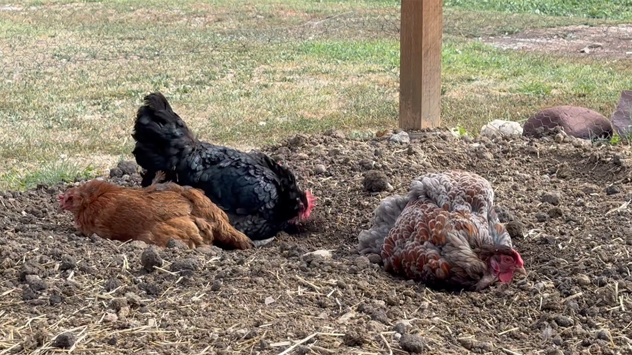 Thanks to a recent Eagle Scout project, our hens have an enlarged outdoor space to enjoy their dirt baths and sunshine. Did you know, chickens love to dig holes and coat their feathers with dirt. This is their way of keeping themselves clean. You may see them wiggle in the dirt as they try to get a good thorough cleaning in and among their fluffed up feathers. Once satisfied they will preen their feathers with their beak, to remove excess dust and dirt and smooth the oil secreted from a gland at the base of their tail over their feathers to remove loose feathers.