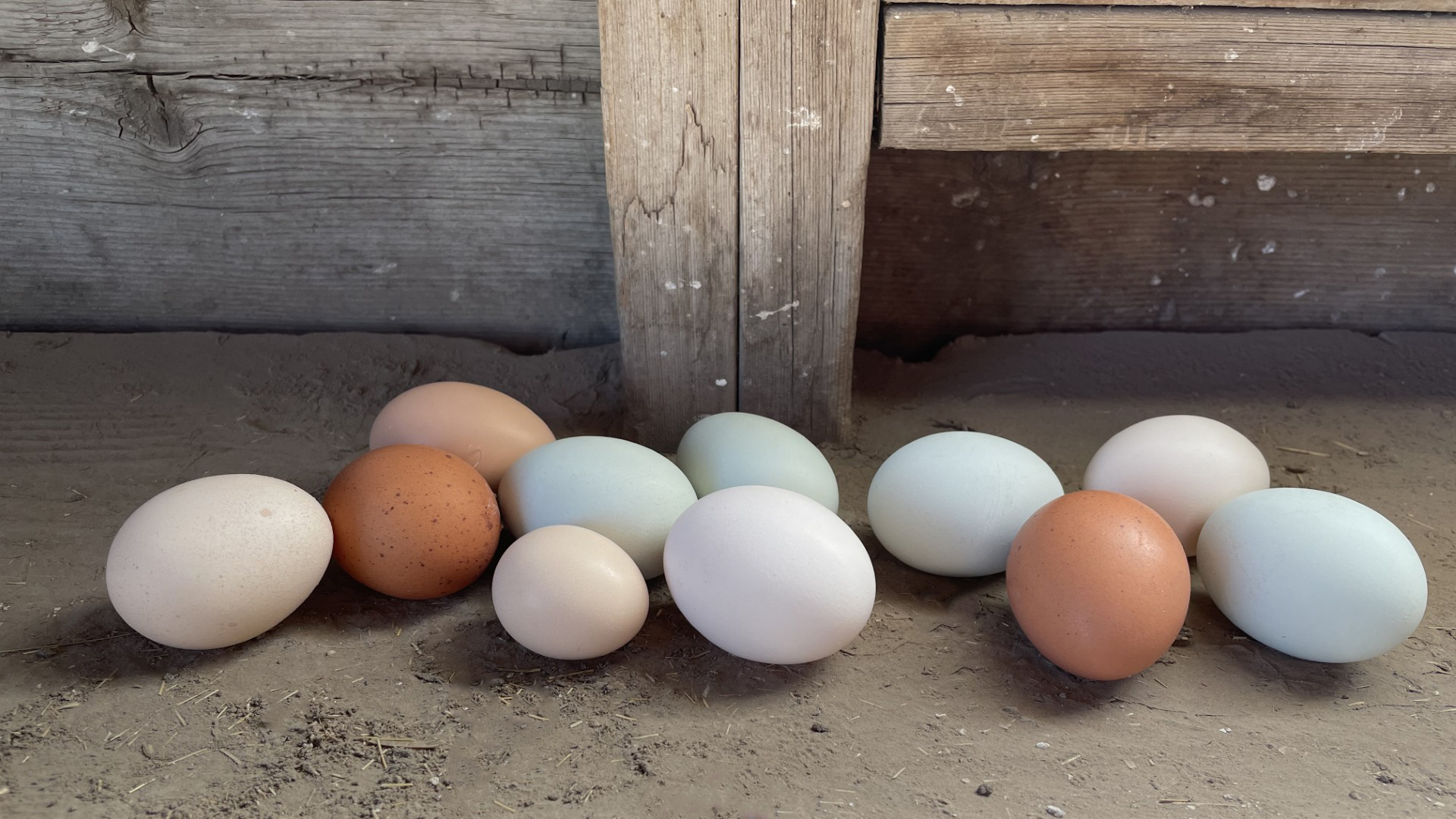 Schweiger Ranch hens are a variety of different breeds, each laying approximately 150-300 eggs a year in colors ranging from white, brown, to green. During the Fall, the hens will molt their feathers in preparation to grow new winter feathers to keep them warm during the cold months. During this time, they will temporarily stop laying eggs while their bodies expend needed energy to regrow their feathers.