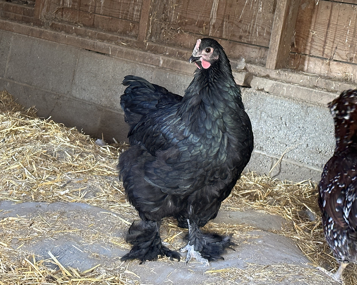Cochins originated in China and were introduced to the West in the mid-1800s, where they quickly became popular during Queen Victoria’s poultry craze. Black Cochins are known for their massive, fluffy appearance, with glossy black plumage that shimmers with a green tint and feathers that cover even their legs and feet. They are not prolific egg layers, averaging about 150–180 medium brown eggs per year, but they more than make up for it in personality and looks. These gentle giants are calm, friendly, and love human attention, often following our volunteers around the coop and run, ready for their treats of dried meal worms. Cochins frequently go broody and are excellent mothers, making them valuable for raising chicks. With their feathered feet and oversized fluff, they are often described as “walking feather balls” and are prized as ornamental birds.